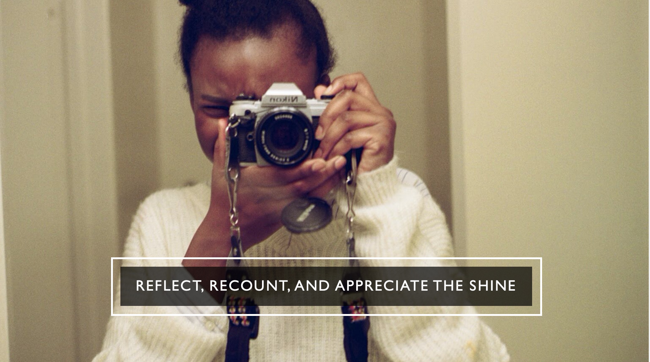 A screenshot from my PowerPoint presentation, with caption “Reflect, Recount, and Appreciate the Shine.”
