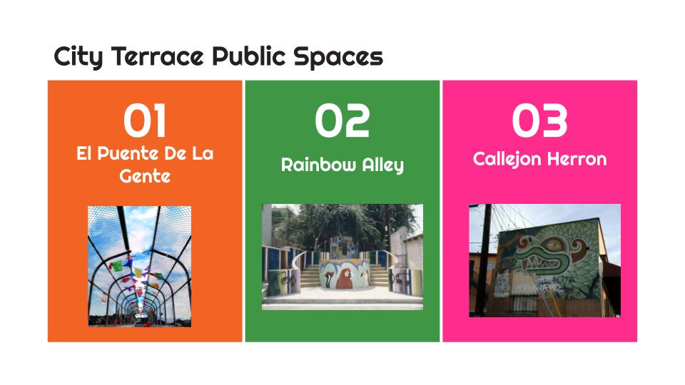 Using public spaces in the City Terrace neighborhood, I created a presentation deck designed to teach students + residents the impact people have on ordinary public spaces. The deck explores: El Puente De la Gente, an overpass bridge turned into art exhibit/community space; an alley coined “Callejon Herron,” because of a local artists murals in the alley; and Rainbow Alley, a now chained up lot that was once a walkway filled with a community mural. These three spaces share one thing in common, they’ve been transformed by residents to embody the resiliency and personality of the East LA neighborhood.