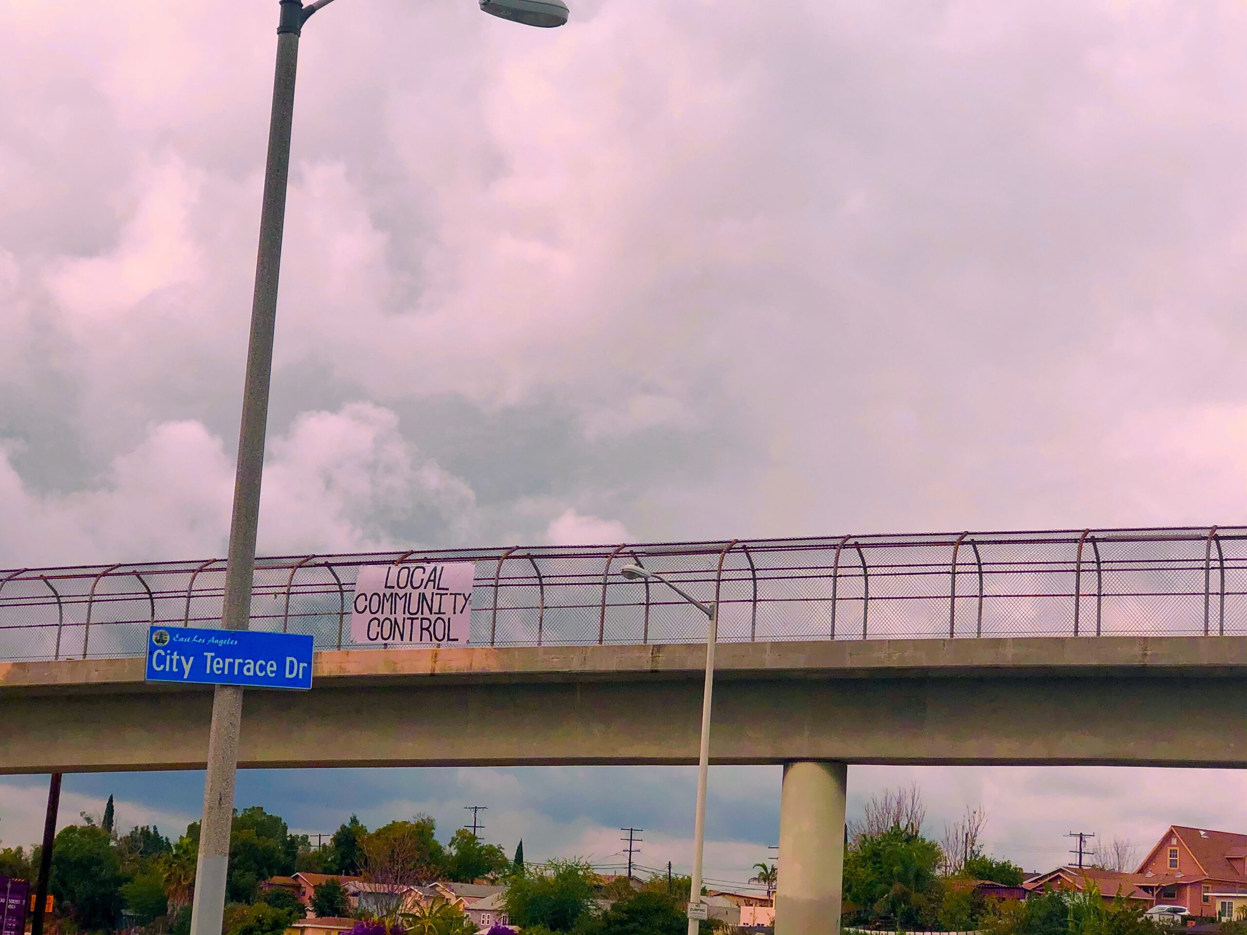 An overpass bridge on City Terrace Dr. with a large banner reading “Local Community Control” Photo by Brisa Aviles