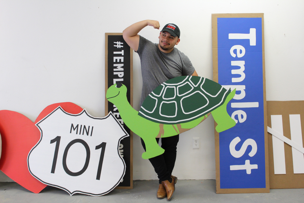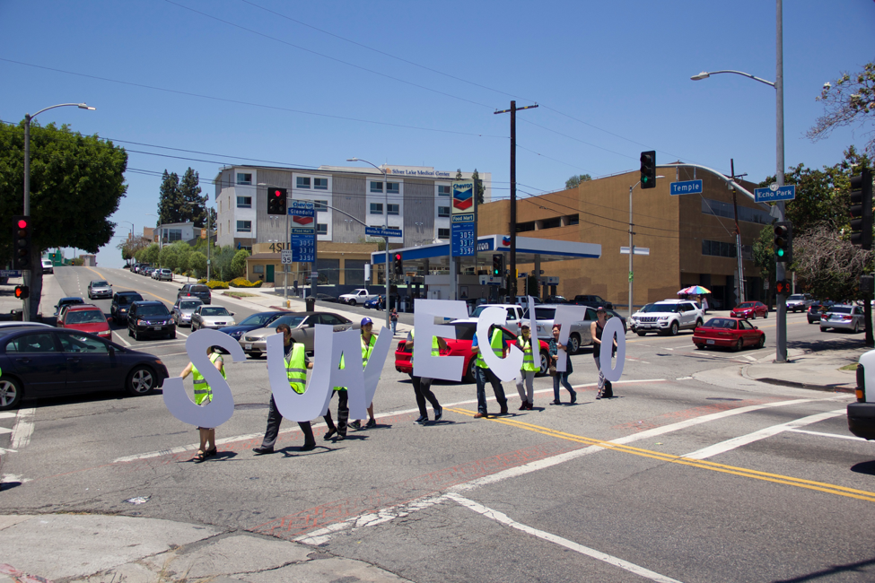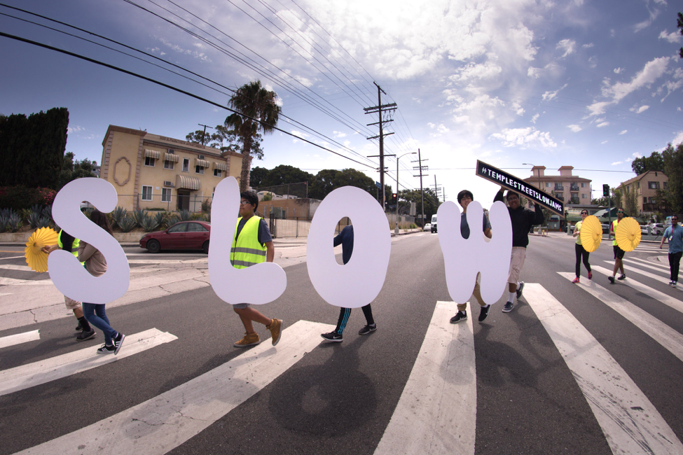 Temple Street Slow Jams was a week-long activation of Temple Street, in the Historic Filipinotown and Echo Park neighborhoods. It had crosswalk choreography, street spectacles, and giant props that encouraged drivers to slow down to create a safer street. Prior to the activation, we spent several months doing community outreach and street safety education to folks in order to spread awareness. Temple Street is often referred to as the “Little 101” because of its close proximity to the 101 Freeway and because of the speed that cars use while driving on it.