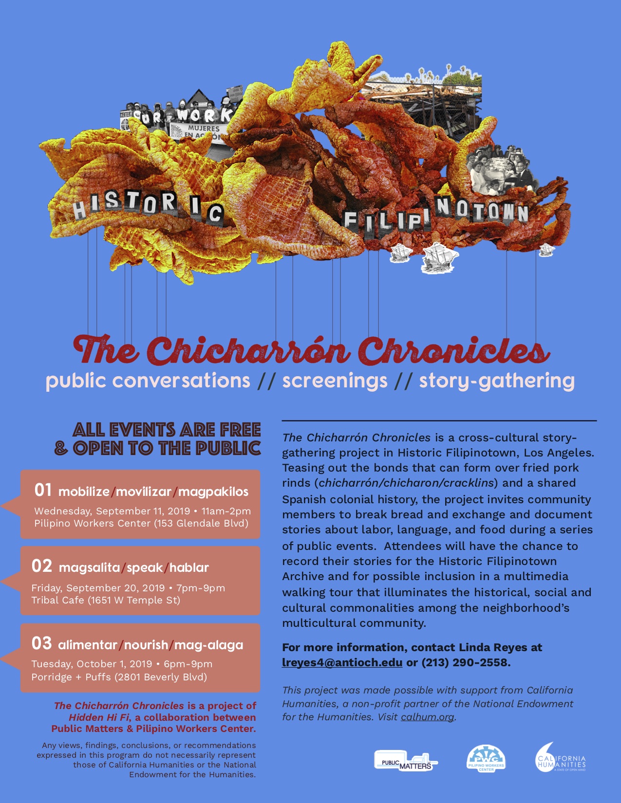 The Chicharrón Chronicles is a cross-cultural story- gathering project in Historic Filipinotown, Los Angeles. Teasing out the bonds that can form over fried pork rinds (chicharrón/chicharon/cracklins) and a shared Spanish colonial history, the project invites community members to break bread and exchange and document stories about labor, language, and food during a series of public events. Attendees had the chance to record their stories for the Historic Filipinotown Archive and for possible inclusion in a multimedia walking tour that illuminates the historical, social and cultural commonalities among the neighborhood’s multicultural community.