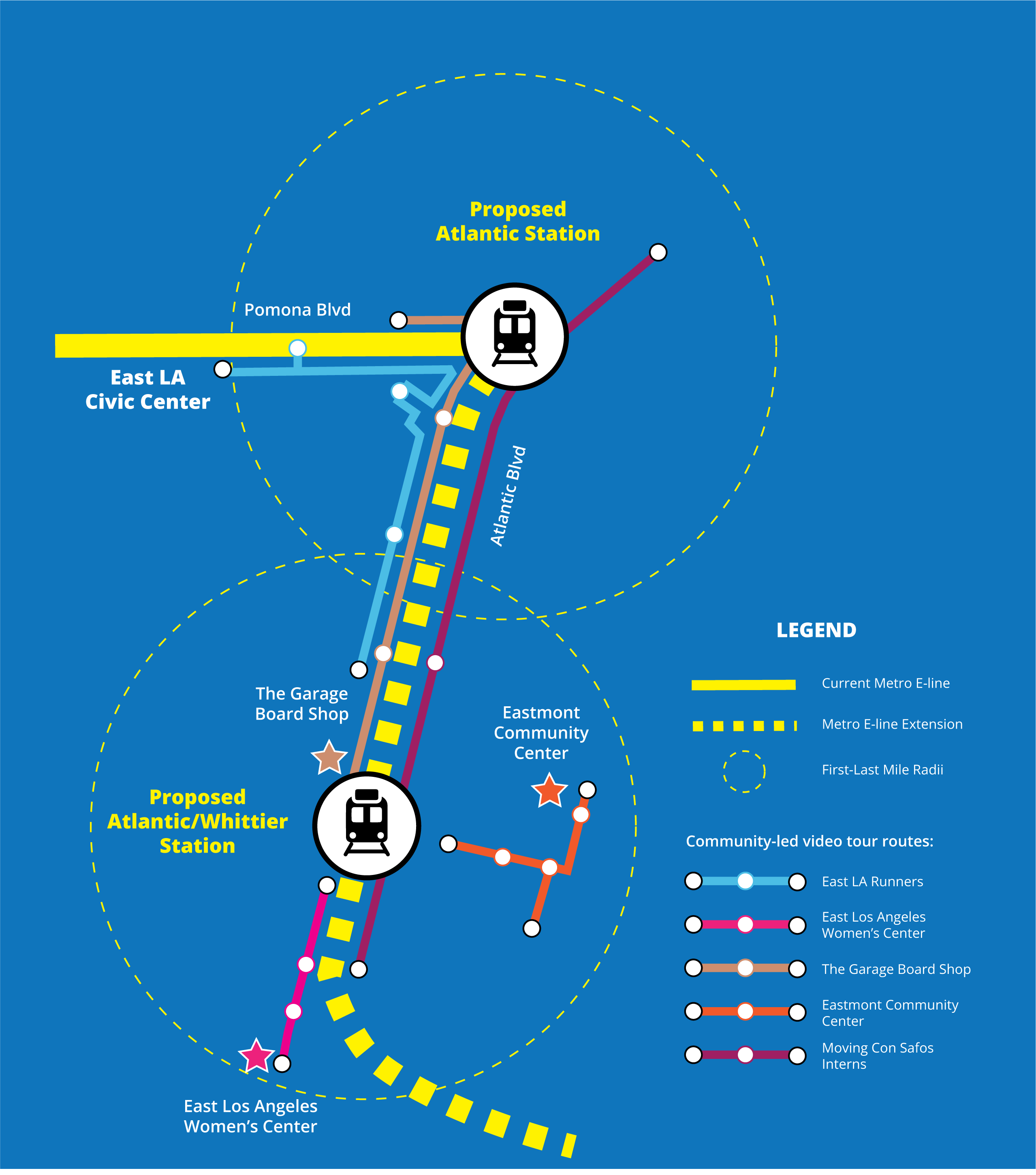 Moving Con Safos (MCS) was a paid summer internship for high school students run by Public Matters for East LA Moves/El Este Se Mueve, a three-year undertaking with LA County Public Works to promote active transportation in East LA by celebrating local culture. Grounded in transportation planning concepts, interns were trained to be active transportation advocates and ambassadors. Drawing from their personal experiences getting around East LA and knowledge of transportation planning, they offered informed perspectives on street safety improvements. Three MCS interns, who study or work within the first/last mile area of the two proposed stations, led the video tour.
