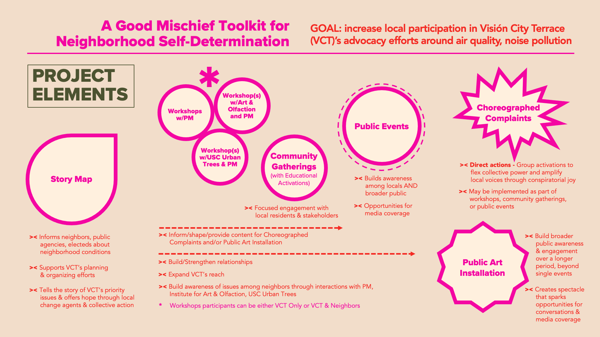 A Good Mischief Toolkit for Neighborhood Self-Determination, led by Public Matters in close collaboration with Visión City Terrace (VCT), a volunteer-based community group, is a multifaceted social practice public artwork aimed at building VCT’s capacity for self-advocacy around environmental justice—air quality, noise pollution, and basic service requests—in East LA’s City Terrace neighborhood.