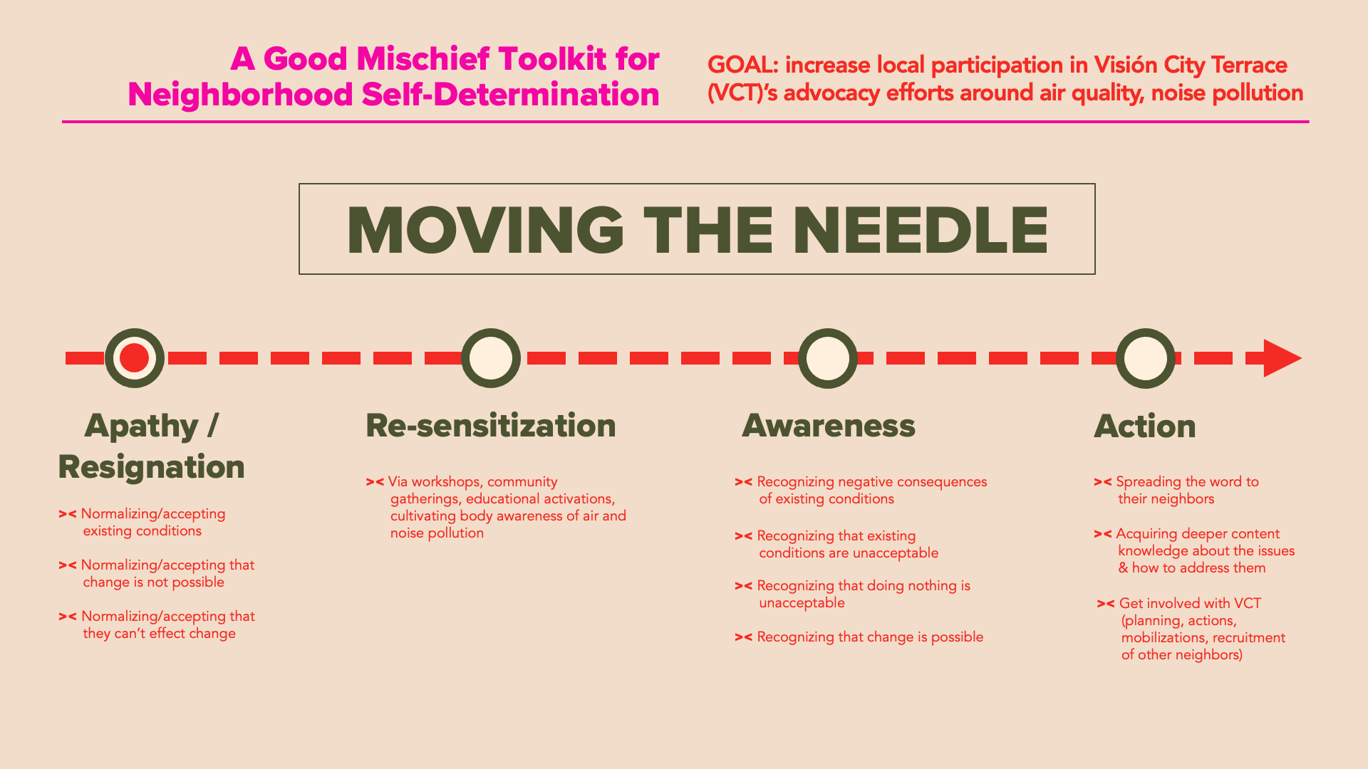 No one can do it alone. Good Mischief cultivated an engagement ecosystem that connected a wide range of individuals, groups, and organizations. As a toolkit, it provided tangible strategies and resources for outreach, language, and visuals that enabled VCT to engage with their neighbors and community to self-advocate and encourage them to act and become stewards of their quality of life.