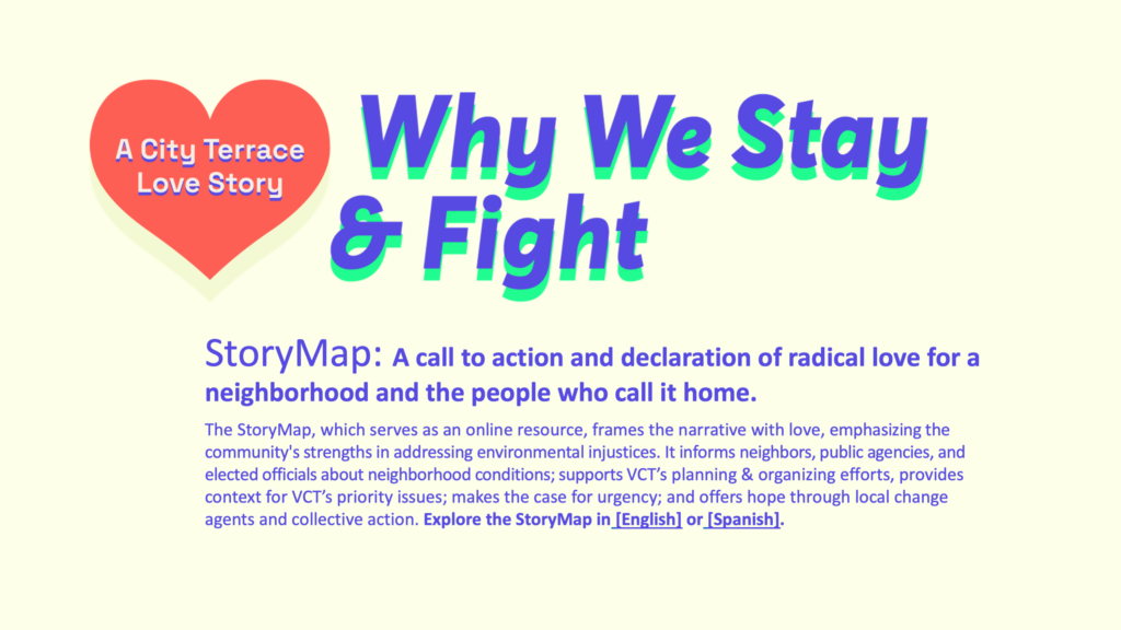 The culminating StoryMap: Why We Stay and Fight, highlights how unequal access to clean air, water, and green spaces impacts neighborhood health and quality of life. It serves as an online resource that frames the narrative with love and emphasizes the community’s strengths in addressing environmental injustices. It informs neighbors, public agencies, and elected officials about neighborhood conditions, makes the case for urgency, and offers hope through local change agents and collective action.