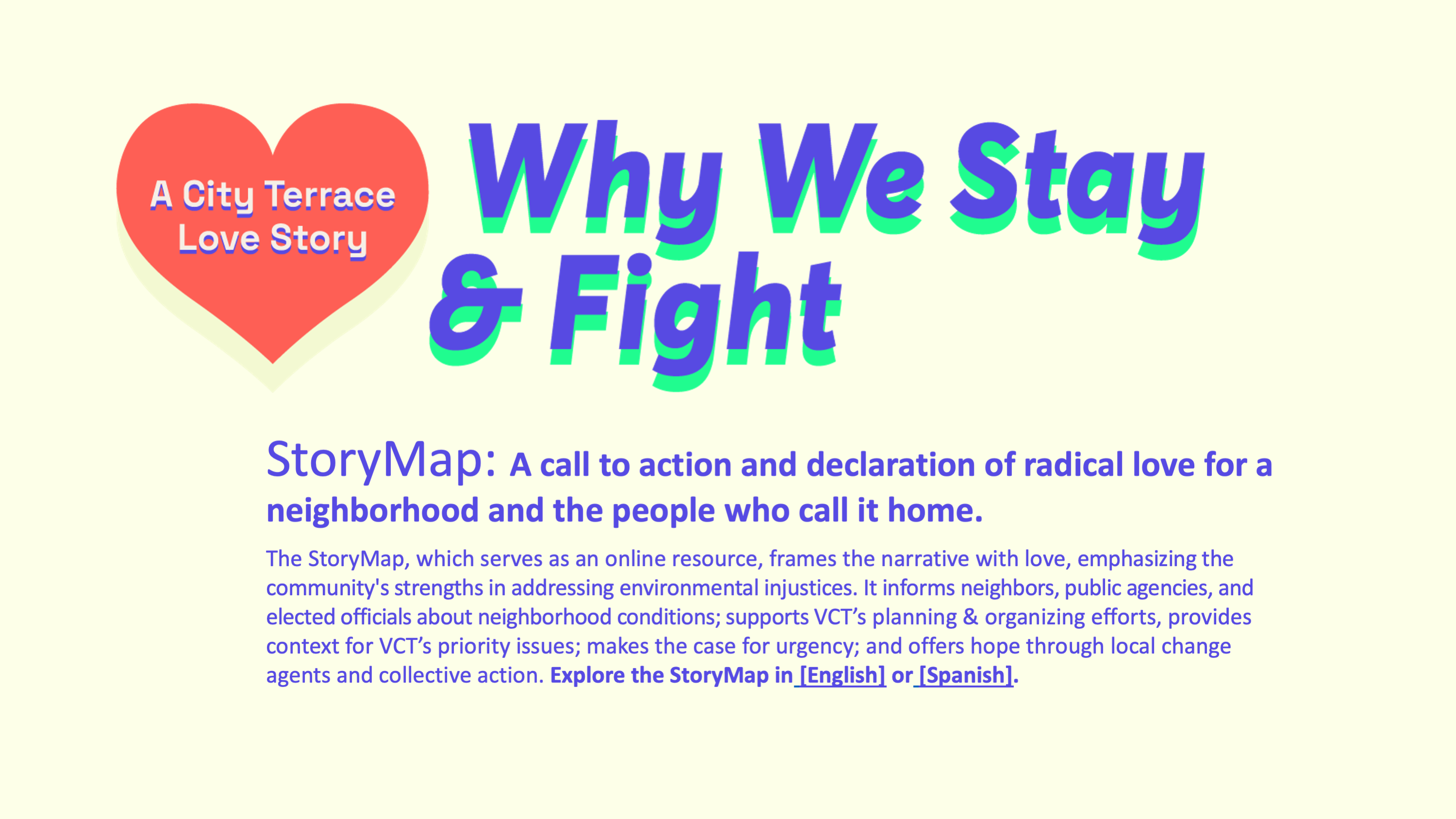 Why We Stay & Fight is a call to action and a declaration of radical love for a neighborhood and the people who call it home. The StoryMap, which serves as an online resource and digital record, frames the narrative with love, emphasizing the community’s strengths in addressing environmental injustices. It informs neighbors, public agencies, and elected officials about neighborhood conditions, makes the case for urgency, and offers hope through local change agents and collective action.