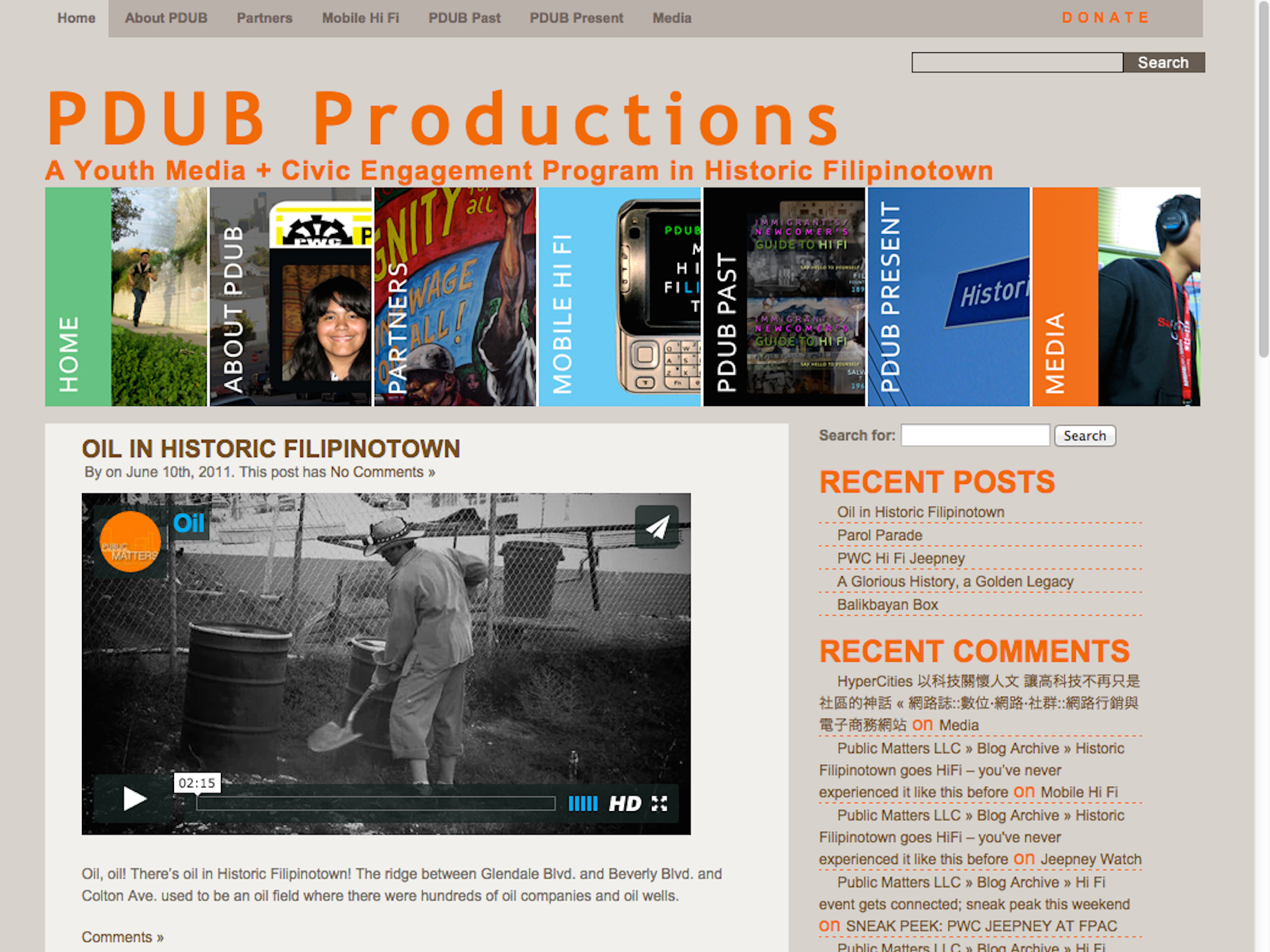 PDUB’s comprehensive hands-on curriculum emphasizes the connection between media production and community benefit, combining neighborhood and cultural history, community journalism, interactive tour design, audio and video production. PDUB Youth participate in a range of activities that strengthen confidence, creativity, leadership skills and civic awareness. They interview guest speakers about neighborhood history, Filipinos in Los Angeles and community activism, and work with prominent scholars and experts in digital media.