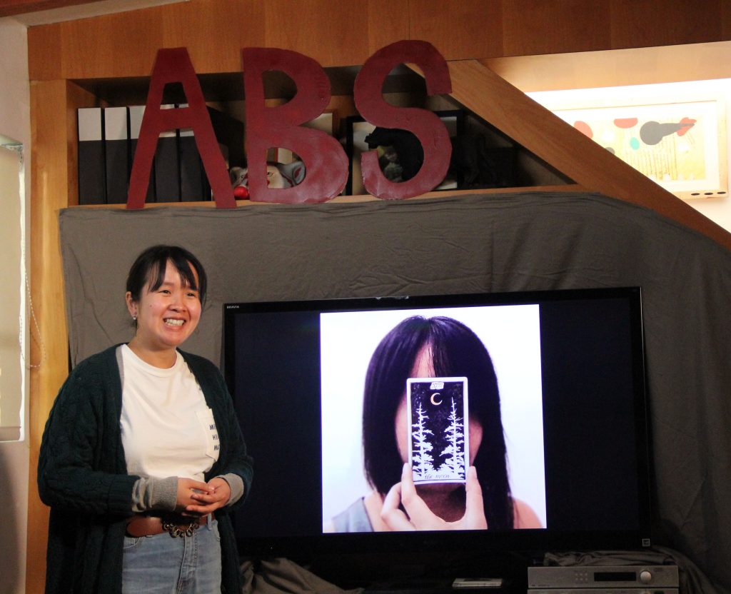 Me while referencing one of the slides in my presentation. The image is a 2017 self-portrait of me holding a tarot card, “The Moon.”