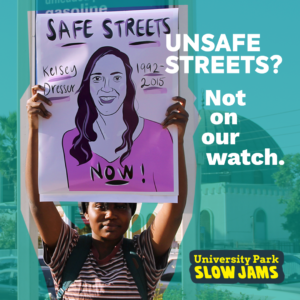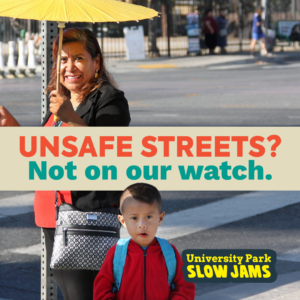 University Park Slow Jams is a creative call to action for safer streets. The project builds a network of local advocates—groups, schools, parents, youth—to draw attention to traffic violence, build capacity, and propose solutions.