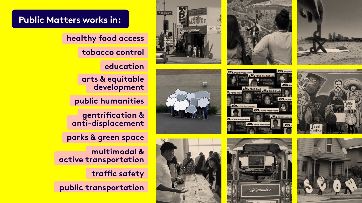 Public Matters implements large-scale, creative community engagement projects throughout Los Angeles, reaching groups that are historically difficult to engage. It has a demonstrated track record of forging long-term interdisciplinary collaborations that bring together large institutions, municipal agencies, local businesses, and schools with residents and grassroots organizations or informal neighborhood groups. Public Matters builds lasting networks–“engagement ecosystems”– among stakeholders that are designed to endure beyond a project’s lifespan.